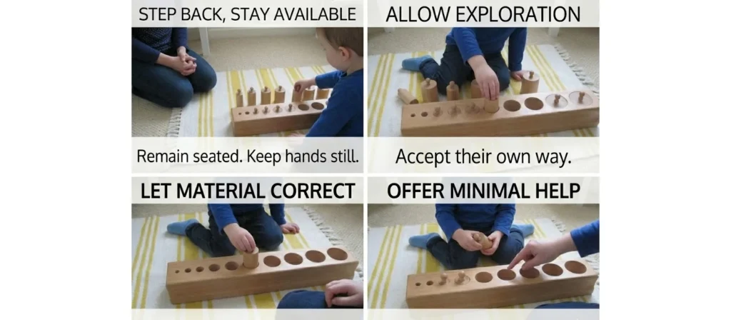 Remain seated nearby and keep your hands still. This gives the child space to explore the knobbed cylinders Montessori material while still feeling your supportive presence.