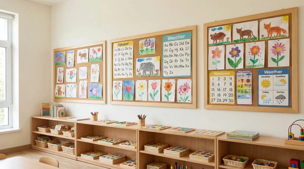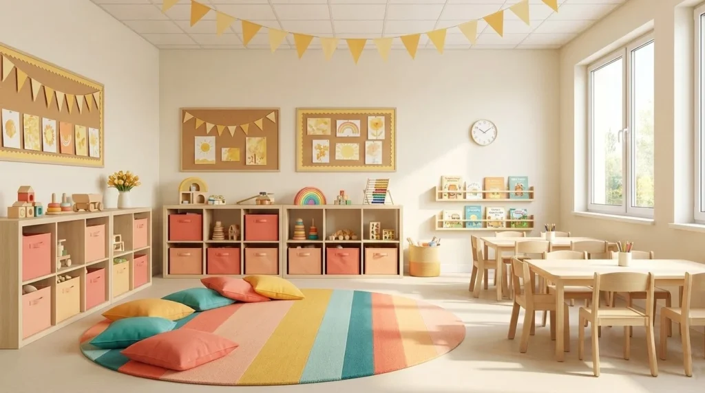 Bright colors can be useful when they are used intentionally. Instead of covering entire walls with bold shades, many classrooms introduce brighter colors through small elements such as storage bins, cushions, labels, or play materials. This approach keeps the classroom lively and engaging while maintaining a balanced visual environment.