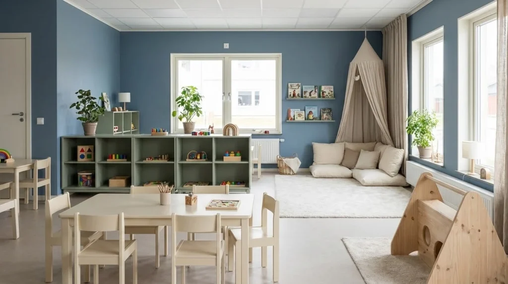 Reading corners, quiet spaces, and rest areas benefit from calmer classroom colors. Soft tones such as muted blue, sage green, and warm beige can help these spaces feel peaceful and comfortable. When children enter these areas, the gentle color palette naturally signals that this is a place for relaxing, reading, or calming down.