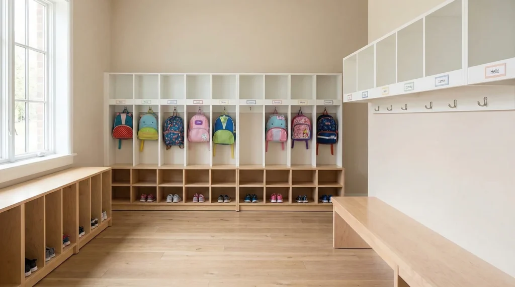 Entry areas, cubbies, and walkways connect the entire classroom environment. These spaces work best when their colors remain simple and consistent with the rest of the room. Soft neutral tones help create a smooth visual flow, making it easier for children to move between activities and understand how the classroom is organized.