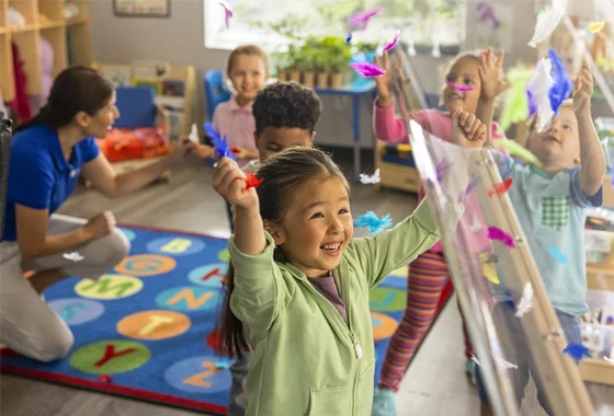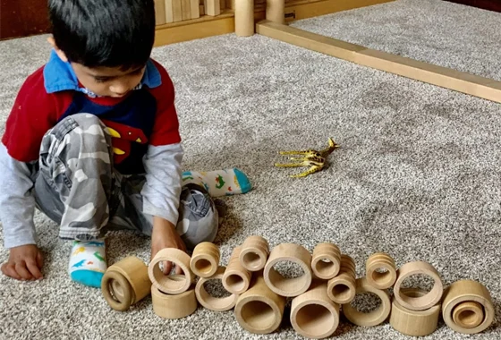 Early childhood education is grounded in tactile experience. Blocks, manipulatives, sorting trays, and dramatic play materials are used directly on the floor.