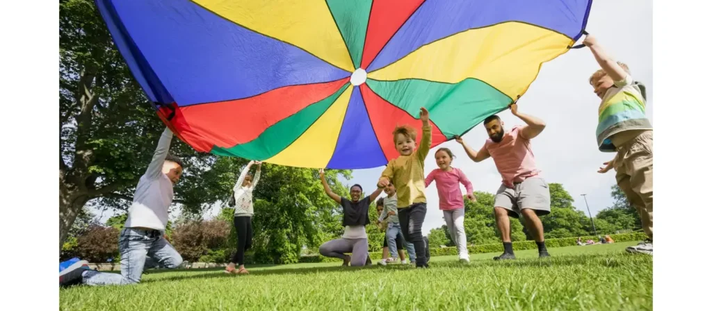 - Introduce simple games like “Popcorn” (toss soft balls on the parachute and shake), “Mushroom” (lift high and sit under it as it floats down), or “Color Call” (lift when your shirt color is called).
