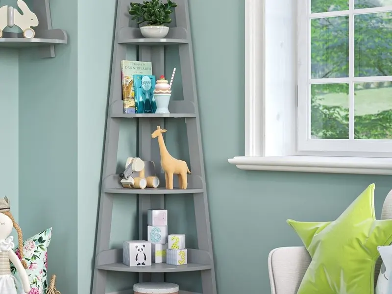 A corner ladder bookshelf is a clever way to turn unused corners into organized reading spaces. Its tiered design draws the eye upward and provides shelves of different depths for books of various sizes. This style keeps the room open and airy while adding a decorative, vertical element that encourages children to explore books independently.