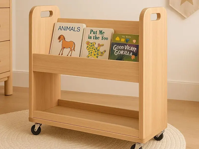 A rolling book cart is one of the most flexible storage options for children’s books. With smooth wheels and open shelves, it allows books to travel easily between rooms or activity zones. The cart’s mobility helps teachers and parents reorganize reading materials quickly, making it an ideal solution for homes, classrooms, and libraries where space and versatility are important.